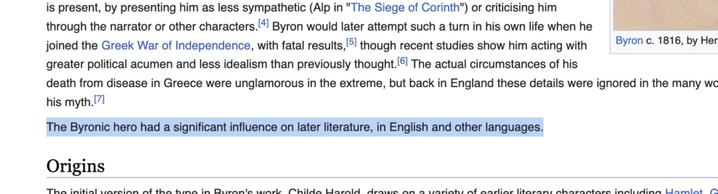 It simply seemed like it was floating in the middle of nowhere, with no real direction, and that it did not add anything special or of importance to the overall concept of what the Byronic hero is. Moreover, we get a ‘later influence’ section a mere scroll down, so it was simply unnecessary. Sorry, unknown person that put it there. I had to.