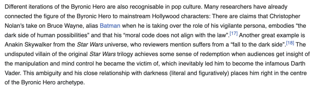 I decided it would be a good idea to add more mainstream/film/pop culture characters to the “influences” section, as I feel the archetype is a big part of the media we consume and people do not always make that connection. It was a part I thoroughly enjoyed researching for my undergrad thesis, and something I thought casual readers would like to encounter if they were to randomly stumble upon the Byronic Hero page.